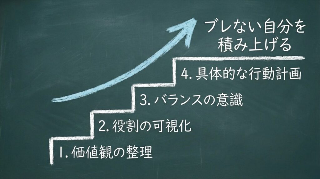 まずは、「自分は何を大切にしたいのか」「どんな人生を送りたいのか」といった根本的な価値観を言葉にします。これが全ての原点となります。