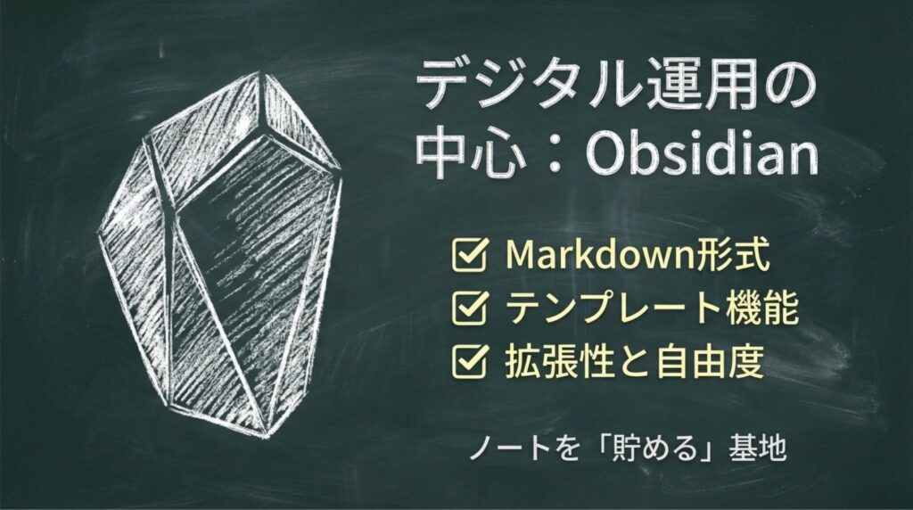 このデジタル実践の基盤となるのは、「Obsidian」というノートアプリです。世の中にはさまざまなメモアプリやノートアプリがありますが、Obsidianを選ぶ最大の理由は「Markdown形式」で記入できる点です。Markdownで記録した内容は、そのままAIに渡して処理してもらいやすく、データ変換や余計な手間が発生しません。