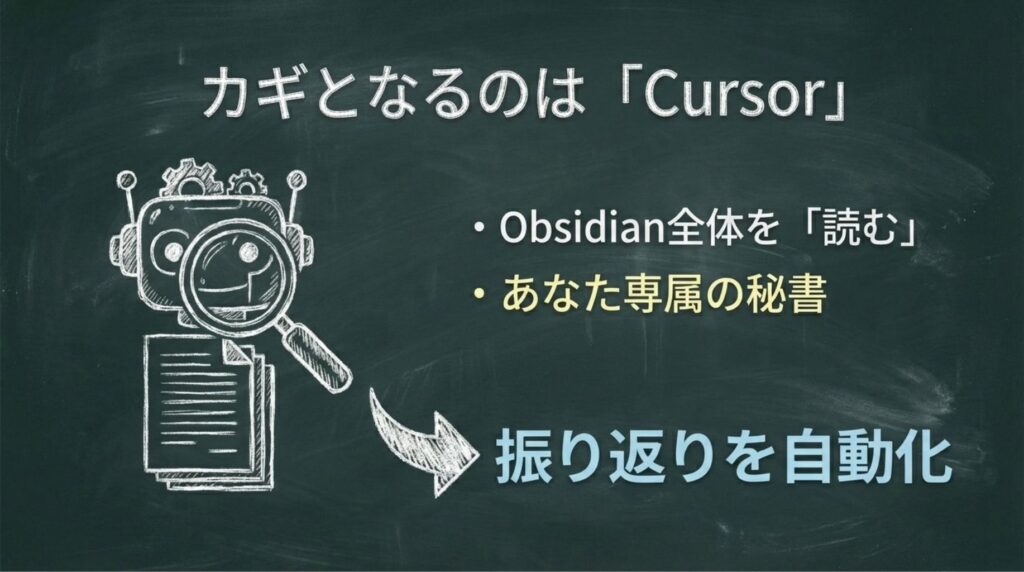 Cursorはプログラマー向けの高機能テキストエディターですが、Obsidianで管理しているノートやフォルダ全体を「丸ごとAIに読ませて活用できる」という特徴があります。このため、Obsidianに貯めた様々な記録や情報を無駄なく活かすことができる点が大きな強みです。