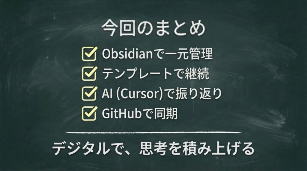 このように、「テンプレートとAIを活用したObsidian管理」と「同期・バックアップのひと工夫」により、pile-up-plannerのデジタル実践を負担なく続けられる環境づくりを目指しています。