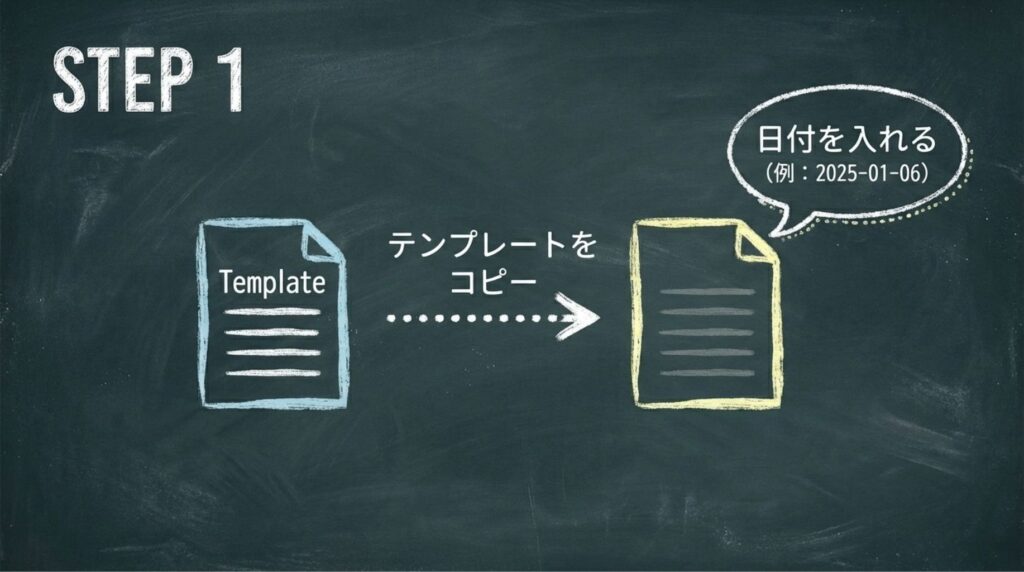 まず最初に、テンプレートファイルから新しいデイリーノートを作成します。Obsidianのテンプレート機能や、手動でコピー&ペーストする方法で、テンプレートをベースにした新しいノートを準備してください。