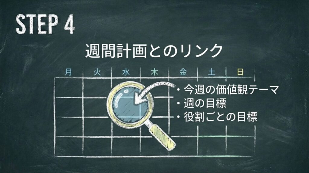 このように、週間計画の価値観テーマを、今日の具体的な行動に落とし込むことで、価値観を日常に根付かせることができます。