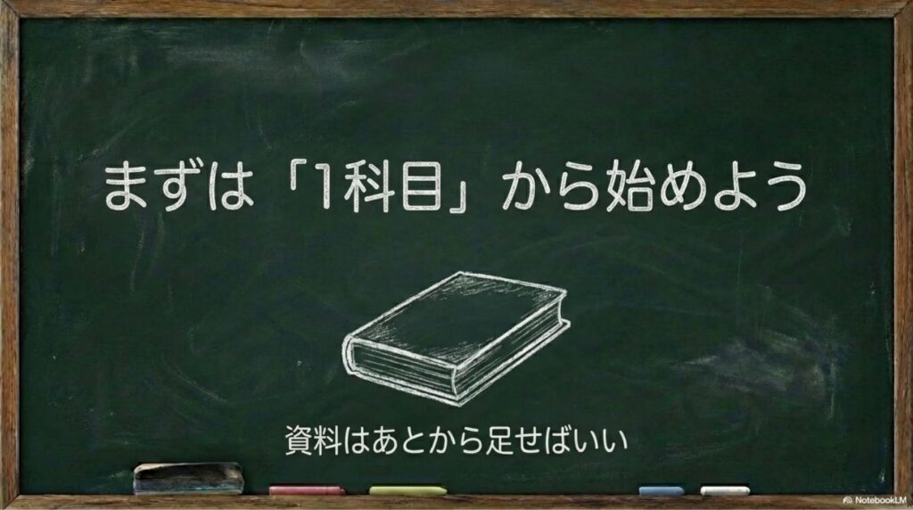 まずは「この科目用の教材ブックを1つ」作って、参考書の1章分や過去問の一部だけ入れても大丈夫です。形が固まってから、少しずつ資料を足していってください。