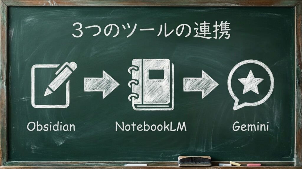 流れのイメージ:Obsidian → Notebook LM(教材ブック)→ Gemini