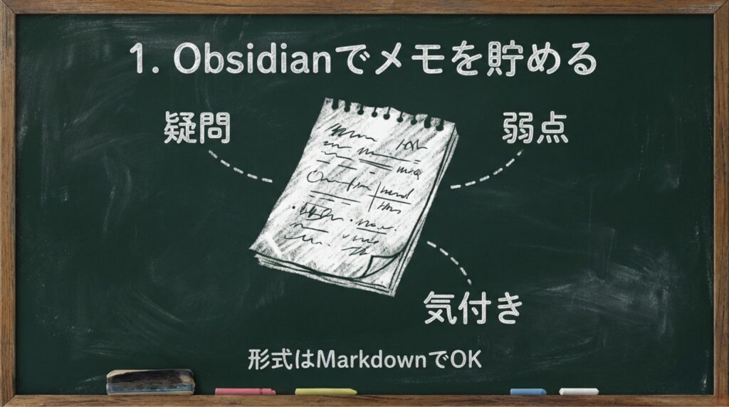 これらを Obsidian のノートやデイリーの MEMO に書いておくと、あとで Notebook LM に読み込ませる材料になります。Notebook LM は Markdown 形式を読み込めるので、Obsidian のノートをコピーして貼り付けたり、エクスポートしたテキストをアップロードしたりすれば、そのままブックに追加できます。学習記録を一箇所にまとめておく利点は、2-1 Obsidianで集める学習メモの記録 や 2-2 Obsidian学習メモのテンプレート で詳しく扱っています。「メモを取る場所」を Obsidian に決めておくと、Notebook LM に渡すときも整理しやすくなります。