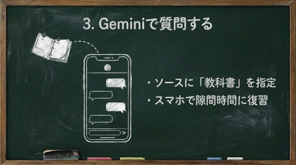 (Notebook LM と Gemini の連携方法は、各サービスの画面に従って設定してください。Gemini 側で「Notebook LM のブックを参照する」ようなオプションが提供されている場合、そこで選択します。スマホでは「このソースを参照して」と都度選ぶ操作が必要になる場合がありますが、学習用は一つのブックに絞っておくと、そのブックを選ぶだけで済み、運用が楽になります。) - 質問