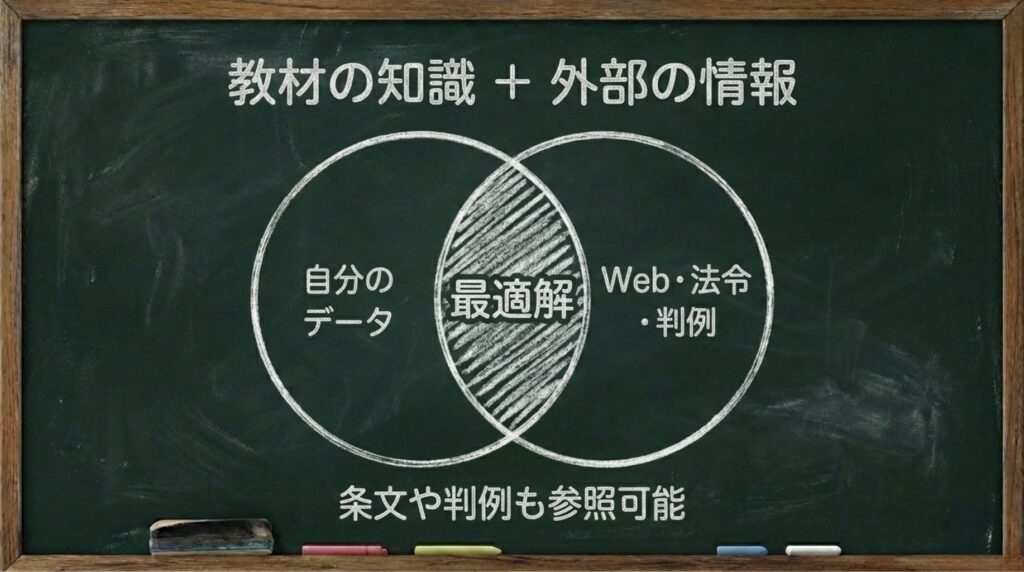 - その結果、「あなたの教材とメモを理解したうえで、必要なら外の情報も取り込んで答えてくれる先生」のような使い方ができます。