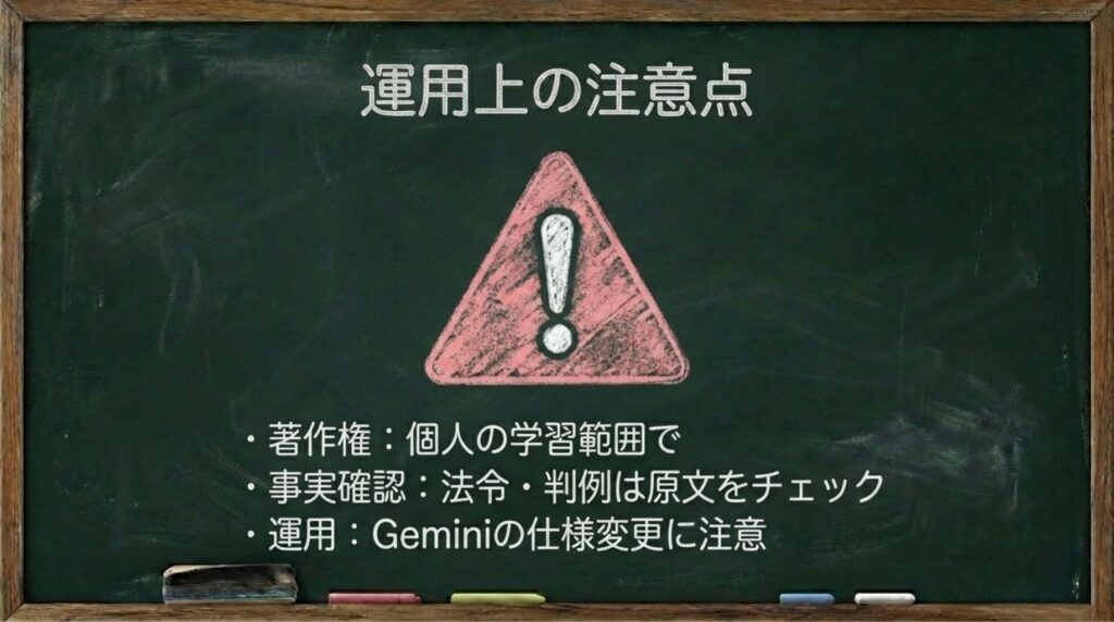 このように使い分けると、「自分専用の先生」としての幅が広がります。条文・条例の内容をよく確認したい方や、指定リソースの偏りが気になる方には、Gemini を主に使う運用が向いています。